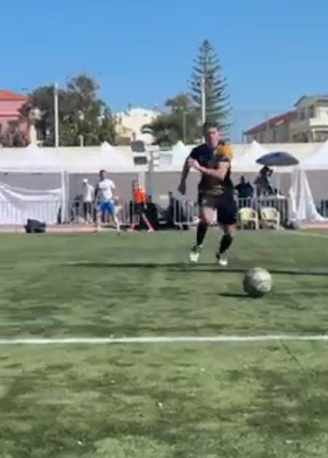 soccer match in progress. One player in a white and blue uniform dribbles the ball toward the goal, trailed by a defender in a black and yellow uniform. The player in black and yellow gains possession and kicks the ball, apparently toward the goal. The goalkeeper in a green uniform is visible in the goal. Spectators are seated in the background. Tents and buildings are also visible behind the field. The weather is sunny with a clear blue sky.