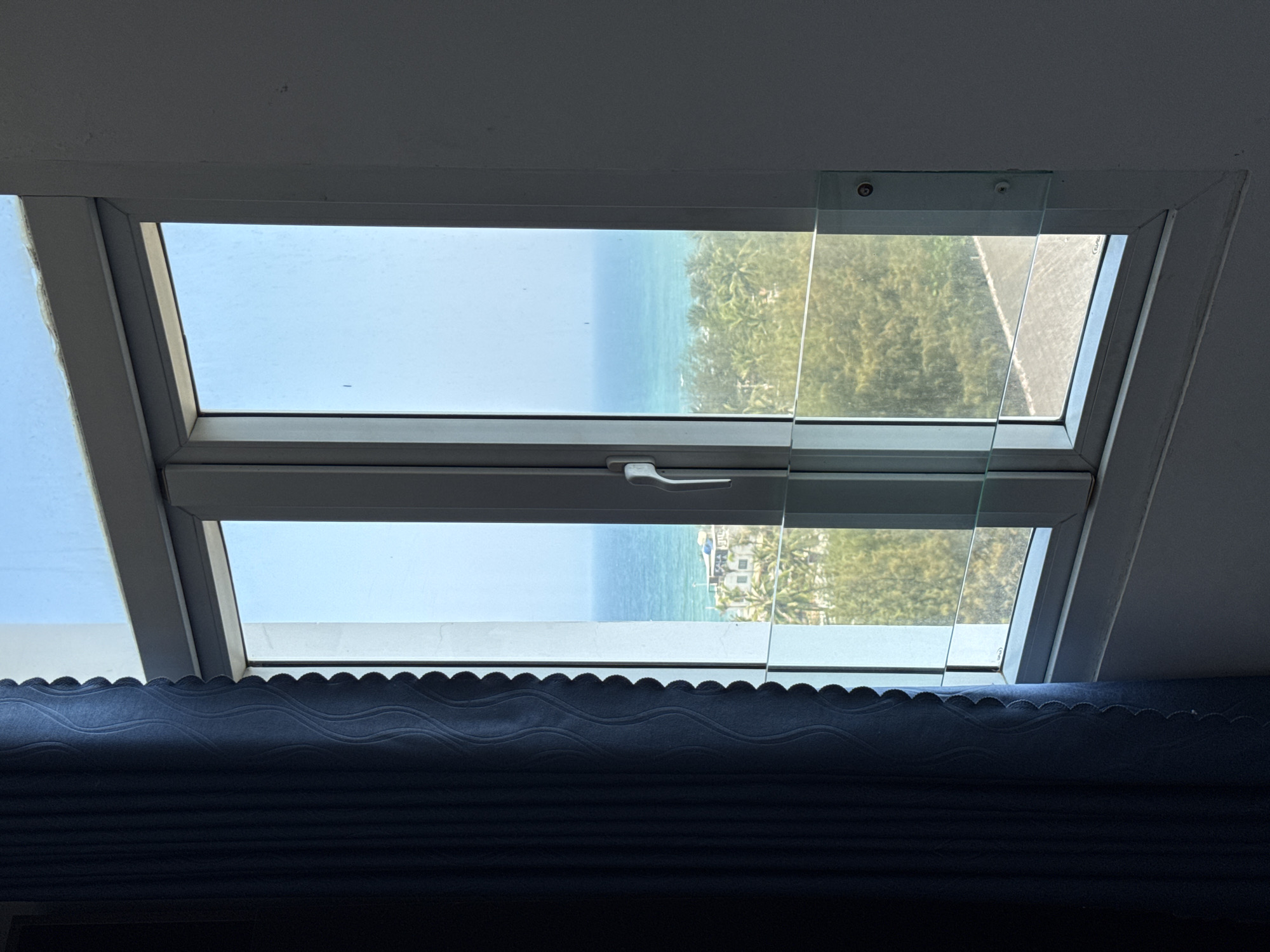 A window is open, revealing a view of the ocean, a green shoreline, and a building with a white roof