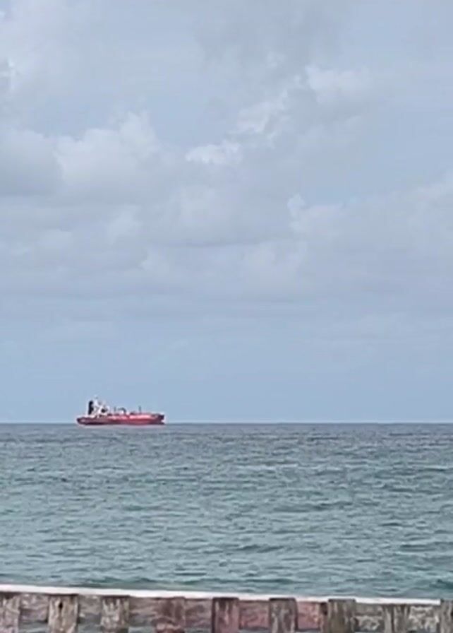 distant red ship on a wavy ocean under a cloudy sky, viewed through a wooden fence. Children's voices are audible in the background.