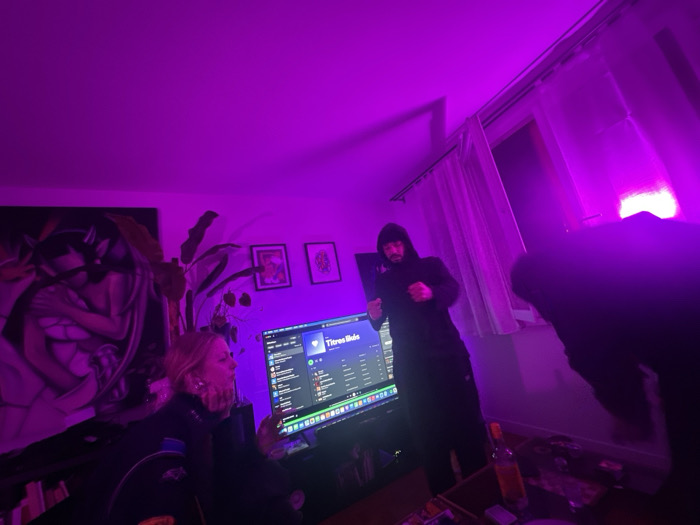 A dimly lit room bathed in purple light features three people. One person sits in front of a large computer screen displaying a music app. Another person, wearing a hoodie, stands in the center. A third person is partially visible on the right side. A large painting and a potted plant adorn the wall. A table in the foreground holds various items, including a bottle. The room's lighting makes it challenging to discern details.