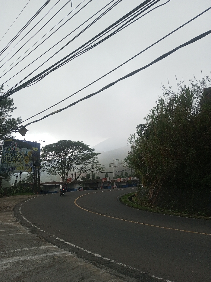 The image depicts a winding asphalt road, marked with a continuous yellow center line and white edge lines, curving to the right, in the city of Siruppiddy, Sri Lanka. The scene is overcast, with hills or mountains in the background partially obscured by mist or fog. On the left side of the road, a large billboard is visible, prominently displaying the words "EPIC" and "BRASCO," alongside images suggesting food or beverage products. Behind the billboard, a large, mature tree with a full green canopy stands. Below the billboard and tree, a series of small structures with blue and white facades, resembling vendor stalls or shops, line the roadside. Multiple thick, black electrical or communication lines crisscross the upper left portion of the frame, descending towards the foreground. A paved concrete shoulder with etched patterns is in the immediate foreground on the left. A single dark-colored motorcycle, operated by one rider, is observed on the road, mid-curve, traveling away from the viewer. On the right side of the road, a steep embankment is covered with dense, green vegetation, including tall grasses and various bushes. A narrow drainage channel runs parallel to the road at the base of this embankment.