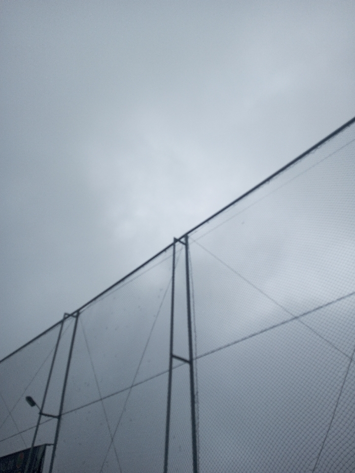 The image depicts an outdoor scene in Irupalai, Sri Lanka, under an overcast sky. A tall, dark-colored mesh fence or netting, supported by metal poles and tension wires, dominates the lower and middle sections of the frame, extending from the left to the right edge. The netting features a square grid pattern. A street light or floodlight fixture is visible on a pole behind the fence on the lower left. A blurry, dark banner or sign is partially discernible at the very bottom left, beneath the light. No individuals or specific activities are present within the captured scene. The overall lighting is dim, consistent with a heavily clouded day.