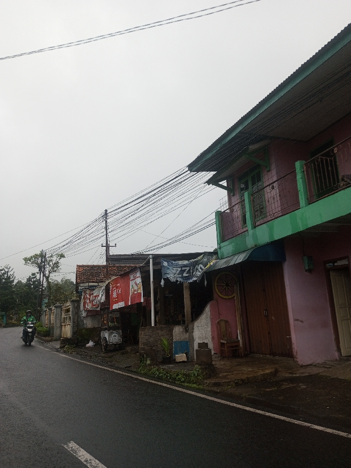 The image depicts a street scene in Babaliya Mal., India, under an overcast sky. A damp, asphalt road with a white solid line on its left edge occupies the foreground and extends into the midground. A single individual, wearing a green jacket, operates a black motorcycle, heading away from the viewer on the left side of the road. On the right side of the street, a sequence of buildings is visible. The prominent building on the far right is a two-story structure painted a muted pink/purple hue. Its ground floor features a closed wooden double door and an adjacent open lighter-colored door. The second story includes a green-framed window or door and a balcony with green railings, protected by a green corrugated metal overhang. The roof of this building is a green corrugated metal. Immediately to the left of this building, a ground-level storefront is discernible, displaying a torn, blue banner with "ZZI" partially visible in white text. A decorative wooden wagon wheel is mounted on the pink wall to the right of this storefront, and a wooden chair sits beneath it. Further left, a utility pole supports a dense entanglement of black overhead wires that extend across the frame, connecting to the structures. Behind the pole, another building with a reddish-brown tiled roof features several red and white commercial banners. A small vendor cart is positioned in front of this building. To the far left, a concrete wall with an ornate metal gate is visible, beyond which trees are present against the uniform grey sky.
