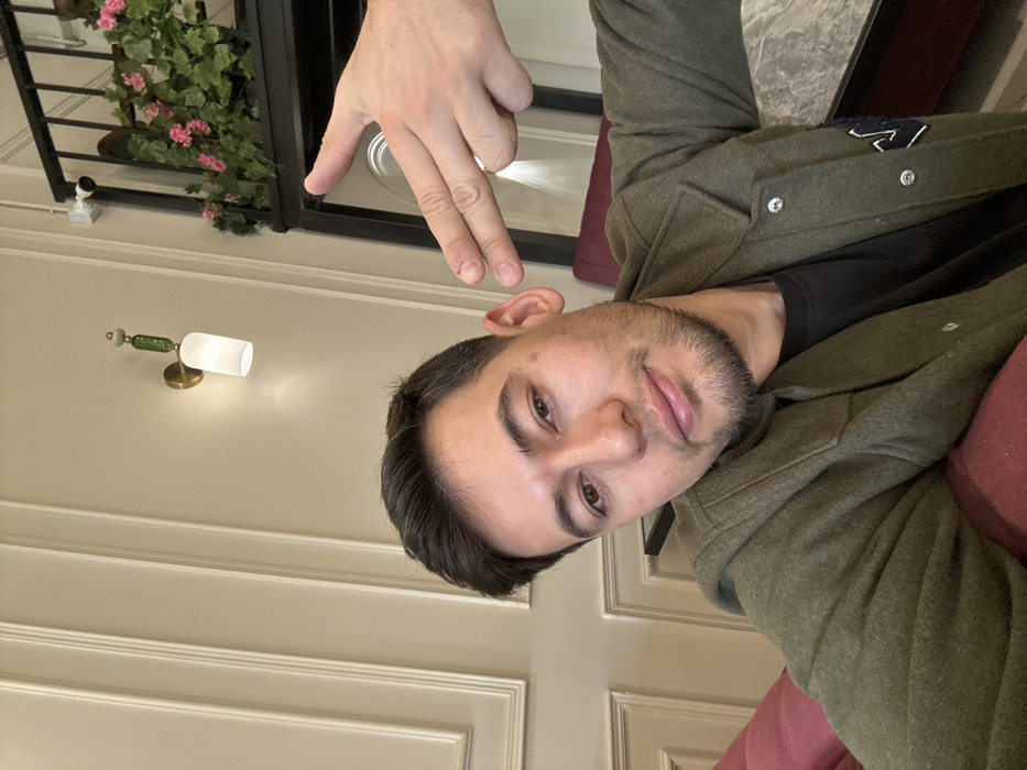 A man angles his head towards the camera. He has short dark hair, dark eyes, and a beard. He wears a black shirt and a green jacket. His hand is visible above his head. In the background, there's a wall with moldings, a wall lamp with a white shade, and a black framed door with plants visible. He appears to be sitting on a burgundy-colored couch. The image orientation is turned to the side.
