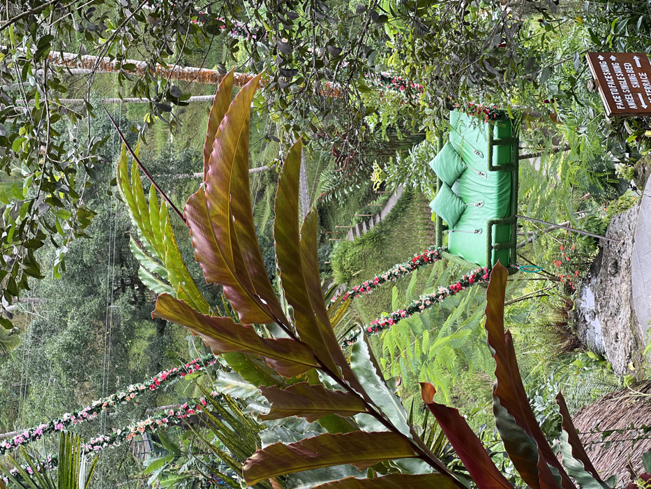 The image displays an outdoor scene in Tegal Suci, Indonesia, characterized by dense tropical vegetation under natural, diffused daylight. In the midground, a large green-padded swing bed is suspended. The swing's ropes are decorated with artificial pink, red, and white flowers. The bed itself is covered in a green textured material, likely artificial turf, and holds two green throw pillows. Four metallic safety harnesses with buckles are affixed to the bed's surface. A thin, grey metal support leg extends from the right side of the swing's base to the ground. In the immediate foreground, large reddish-green tropical leaves partially obscure the left side of the frame. At the bottom left, a section of woven thatch is visible. Below the swing, a stone-paved area abuts a small water feature or stream. The background features a descending terraced landscape, likely cultivated hillsides, with a visible stepped path equipped with wooden railings. The entire area is heavily vegetated with various green trees and plants. Faint power lines are discernable spanning the distant treeline. In the lower right, a wooden directional sign with white text indicates "FACE TO FACE SWING," "ANGEL SINGLE SWING," "SWING BED," and "TERRACE." No individuals are present in the scene.