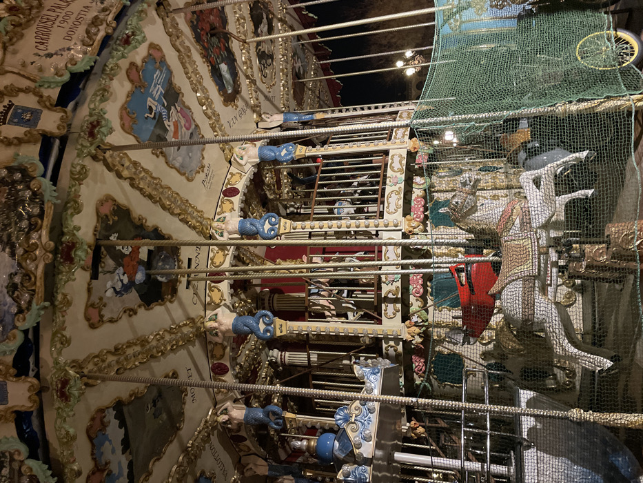 carousel with ornate decorations. The top of the carousel features paintings and intricate gold detailing. The carousel horses are white with red saddles, partially obscured by a green net. There are vertical bars and poles throughout the structure. The scene is dimly lit, creating a somewhat mysterious atmosphere. Labels like "CARROUSEL PALACE 1900 DONOSTIA" are visible on the upper rim.