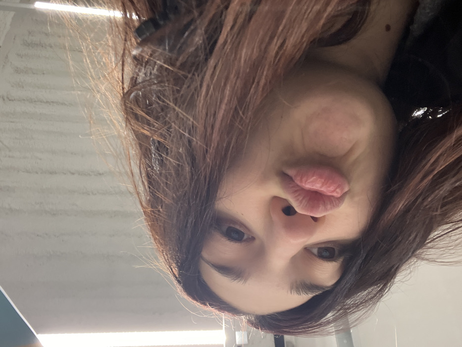 This image, taken in Oberhausbergen, France, presents a close-up, tilted portrait of a young female. Her head is angled, with long, dark brown hair exhibiting reddish undertones. Two dark hair clips are visible within her hair near the top of the frame. Her eyes are open and dark, directed towards the camera. The subject's lips are pursed and extended in a "duck face" expression. A dark garment is visible around her lower neck and shoulder. The background features a light grey wall with vertical striations or texture. A bright vertical light source, consistent with an artificial luminaire, is prominent on the left side of the background, with a fainter vertical light reflection visible on the right.