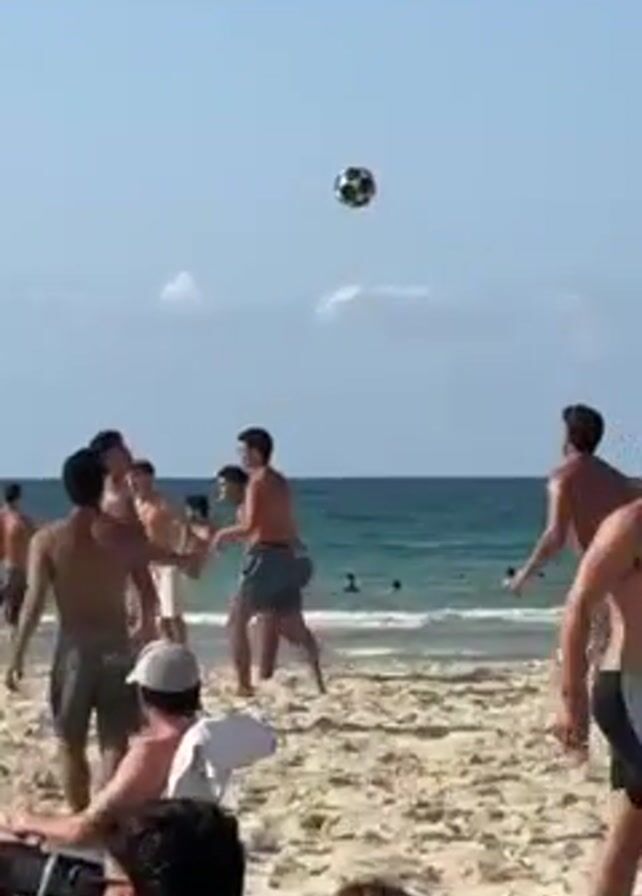 beach scene under a clear, sunny sky. A group of shirtless young men are playing with a soccer ball near the water's edge. Some are actively participating in keeping the ball in the air, while others stand nearby. In the foreground, several people are sitting in beach chairs or on towels, observing the game. The sand is light-colored, and the ocean stretches out to the horizon, with a few swimmers visible in the distance.