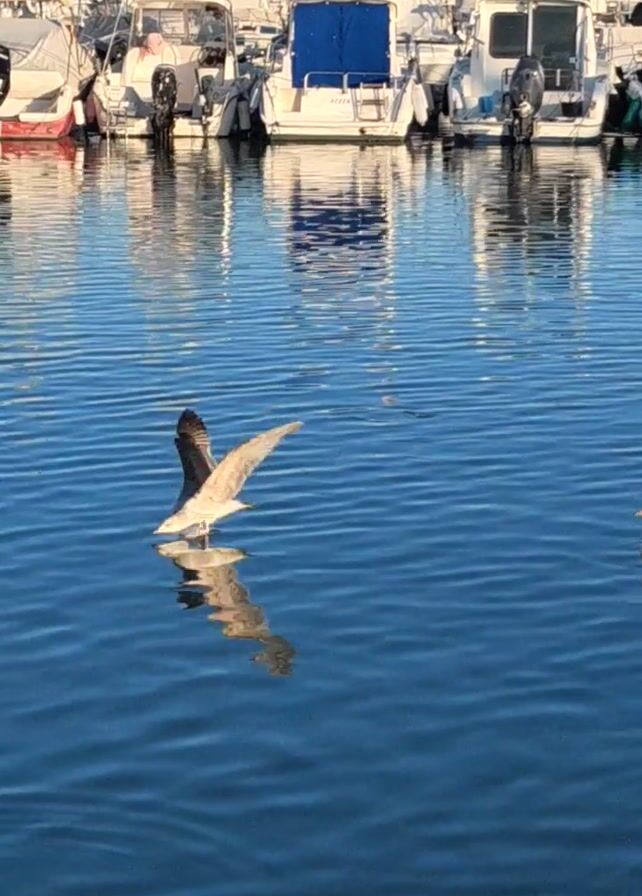 waterfront scene with several boats docked along a pier. The water reflects the boats and the sky, creating a mirror-like effect. A few seagulls are visible in the water; they take flight and move around near the surface. One seagull flies from the water, creating a splash.