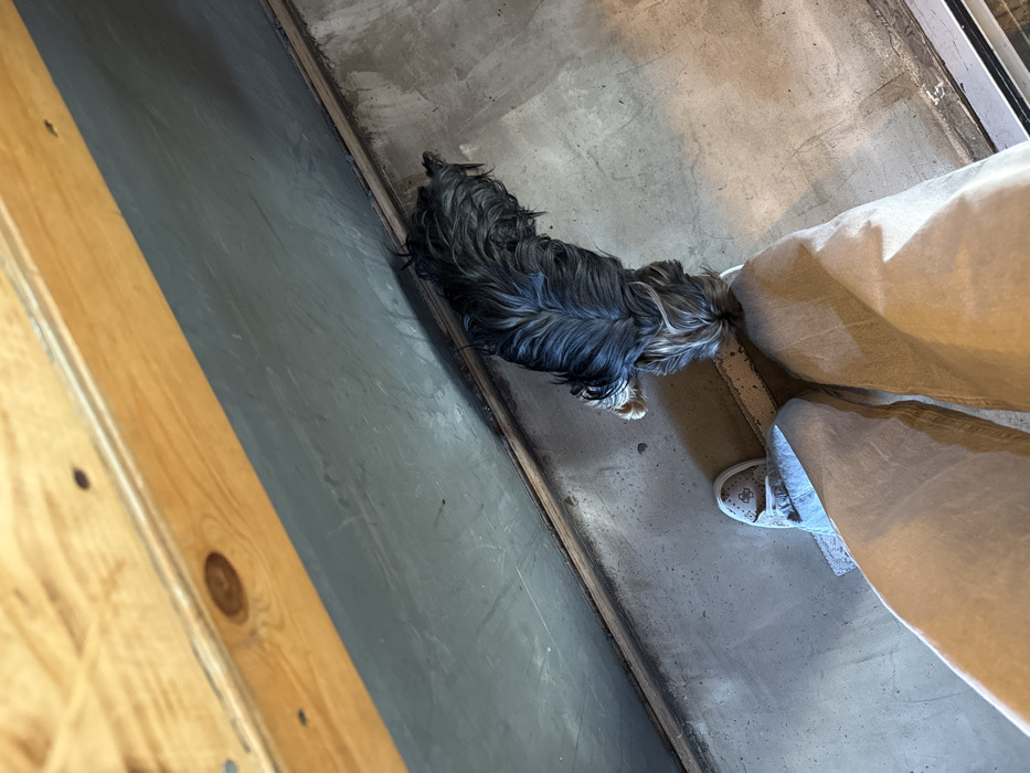- "An overhead view captures a small dog and the lower legs of an individual indoors" by FM-RlxNe2, licensed under CC BY 4.0