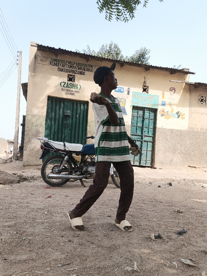 The image depicts an unpaved street scene in Zango, Nigeria, under bright daylight