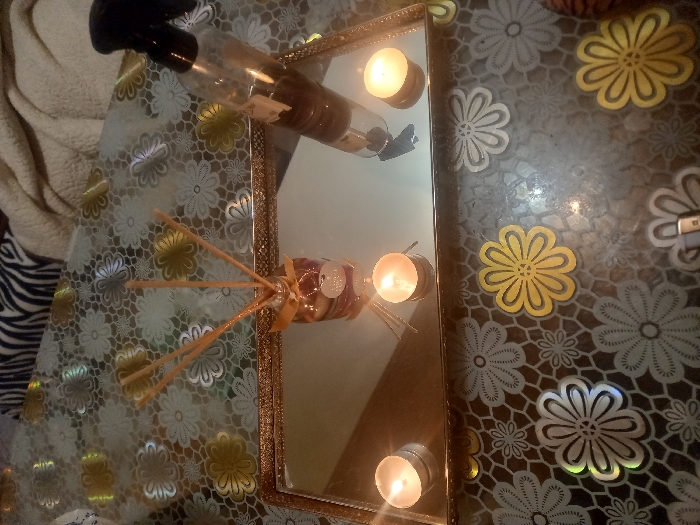 A decorative arrangement is centered on a floral-patterned surface. Atop a gold-framed mirror, three lit candles cast a warm glow. A diffuser with sticks and a bottle sit close by. The mirror reflects these objects, creating an ethereal quality to the scene. A zebra-striped and cream-colored fabric is partially visible in the background.