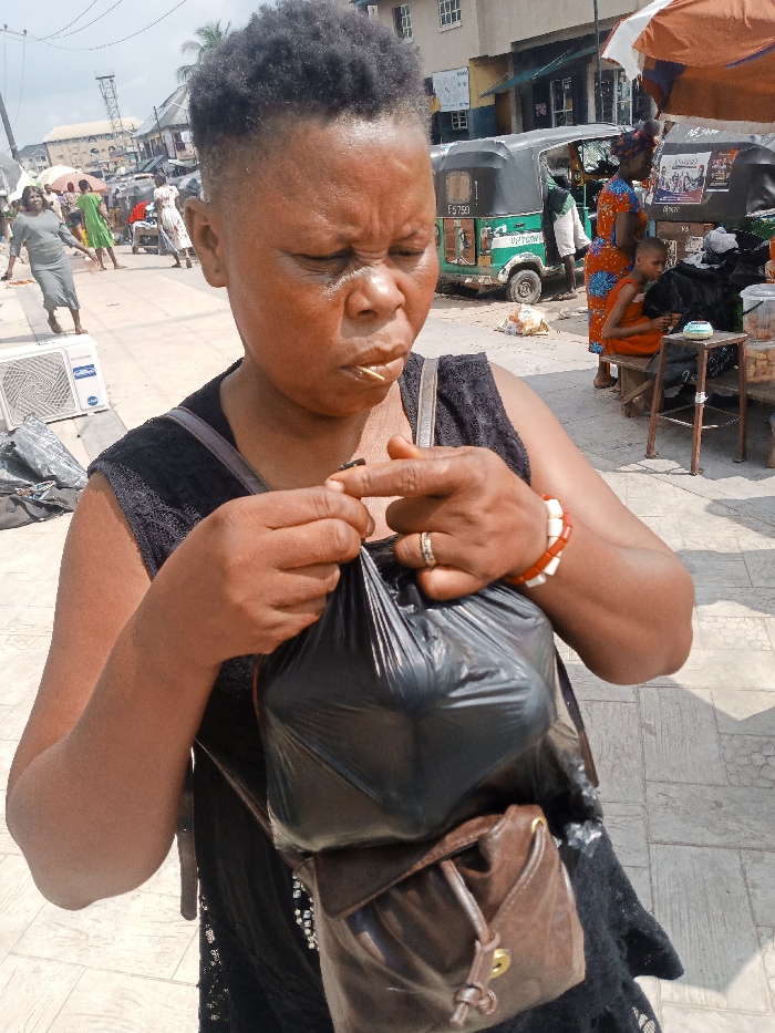 An outdoor street scene in Umuode, Nigeria, is depicted under daylight. In the foreground, a dark-skinned adult female with short, dark, faded hair and a furrowed brow is shown from the chest up. A light-colored stick or toothpick is held between her lips. She wears a black sleeveless top, a gold-colored ring on her left ring finger, and a red and white beaded bracelet on her right wrist. Her hands are actively pinching the opening of a black plastic bag held against her torso, partially obscuring a small brown leather-like drawstring bag suspended from a strap over her shoulder. The immediate ground is paved with light-colored geometric tiles. In the mid-ground, a green and white three-wheeled vehicle, marked "E750," is parked. To the right, a woman in a red and blue patterned dress stands near a market stall covered by an orange-striped umbrella. A child in an orange top is seated on a low stool at this stall, appearing to manipulate small objects. To the left, a woman in a grey dress walks away from the camera, passing a white outdoor air conditioning unit resting on the pavement next to dark, bundled items. The background features various indistinct figures and multi-story buildings under a bright sky.