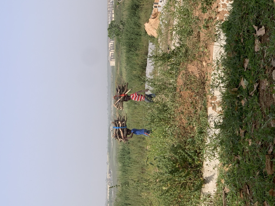 An outdoor scene in Karsana 2, Nigeria, depicts two young individuals walking left to right across a dirt path through overgrown vegetation under a hazy, light-blue sky. The individual on the left wears a blue shirt and trousers, balancing a bundle of firewood secured with blue strapping on their head. The individual on the right wears a red and white striped shirt and dark trousers, similarly balancing a bundle of firewood, secured with red strapping, on their head. In the mid-ground to the right, piles of construction materials including gravel, sand, and concrete blocks are visible. The far background features multiple multi-story buildings, some appearing incomplete, against the horizon. The foreground consists of dense green foliage, exposed reddish-brown soil, and a partial concrete curb on the lower left.