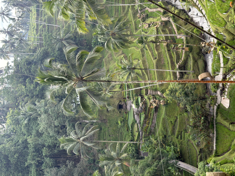 Lush green terraces cascade down a hillside, interspersed with palm trees that reach towards the sky