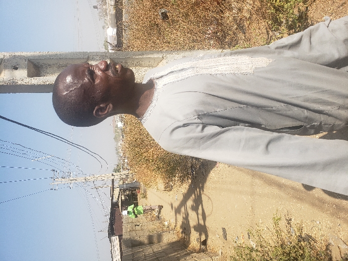 The image depicts an outdoor scene in Iddah, Nigeria, under clear, bright daylight. In the immediate foreground, a dark-skinned adult male is shown in a right-facing profile, extending from his chest upwards. He has short dark hair and visible lines on his forehead. He is wearing a light grey, long-sleeved garment featuring white intricate embroidery down the central front. His mouth is slightly open, and his gaze is directed to the right. To the right and behind him, a light grey concrete utility pole is partially visible. The foreground subject casts a distinct shadow onto the dirt path below. The environment includes a dirt path extending into the background. On the path's left, a low concrete block wall is visible. The path's right side is lined with dry, sparse, brown shrubbery. Further down the path, in the mid-ground, another individual is seen from behind, wearing a bright green long-sleeved shirt and light-colored trousers, appearing to operate a small scooter-like device. In the background, beyond the path and structures, various buildings with corrugated metal roofs are visible, along with a water tank on a stand. Overhead, numerous electrical wires are strung between a prominent utility pole in the mid-ground and other poles against a clear, light blue sky.