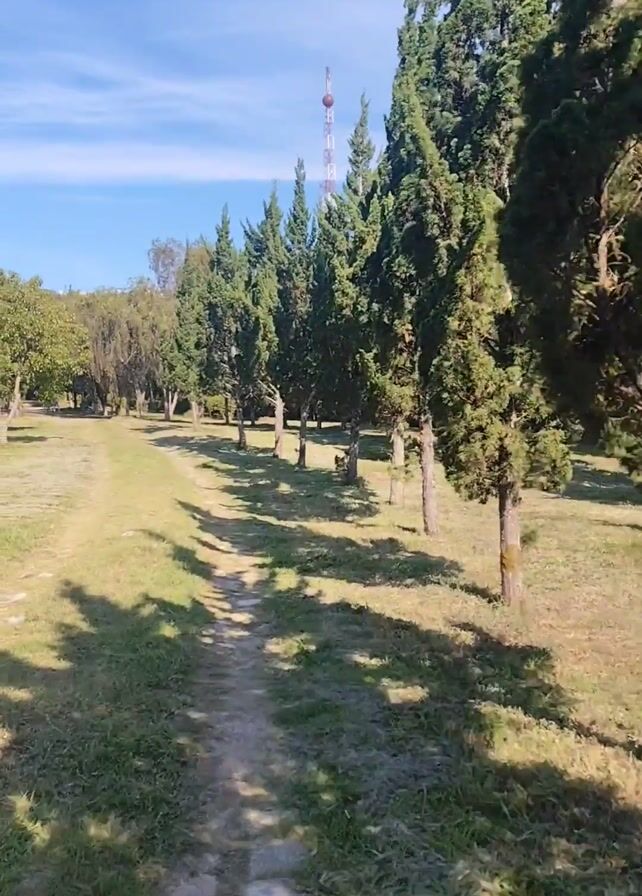 dirt and stone pathway through a grassy park on a sunny day. A line of evergreen trees casts shadows on the path and lawn. In the distance, a radio tower is visible against a blue sky with scattered clouds. The camera moves forward along the path, creating a sense of forward motion.