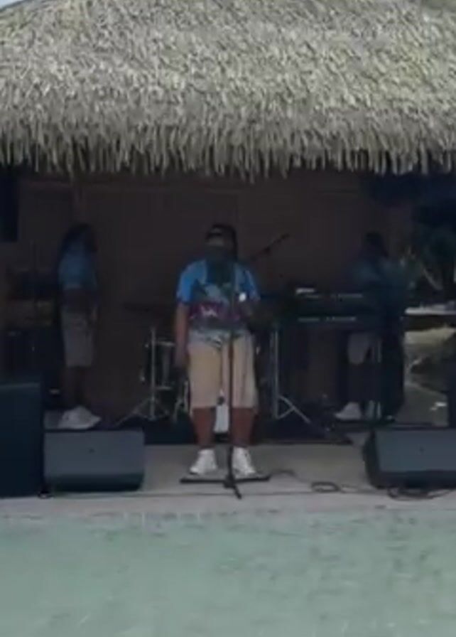 A medium shot captures a band performing on an outdoor stage beneath a thatched roof structure. The singer, a person with dark skin wearing a patterned blue shirt and khaki shorts, stands at the microphone in the center of the stage. Behind them are the other band members with their instruments: drums and a keyboard. Large black speakers flank the stage on both sides. The flooring in front of the stage is composed of green and white tiles. In the background, there is a sandy area that appears to be a beach under a partly cloudy sky. A finger appears momentarily in the bottom center of the screen.