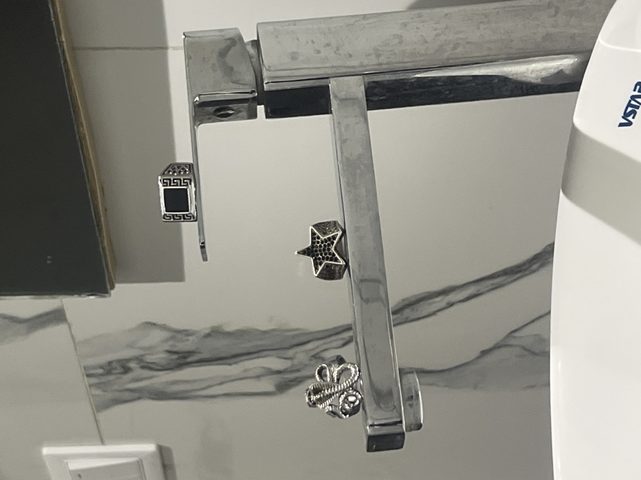 Three silver rings are mounted on a chrome towel rack. The rings are displayed left to right. The first ring has a black square in the middle, trimmed with a maze-like pattern. The second ring is star-shaped and covered with black stones. The third ring is shaped like two snakes intertwined. A white toilet tank is visible on the right. The background is a white and gray marble-patterned wall and floor.
