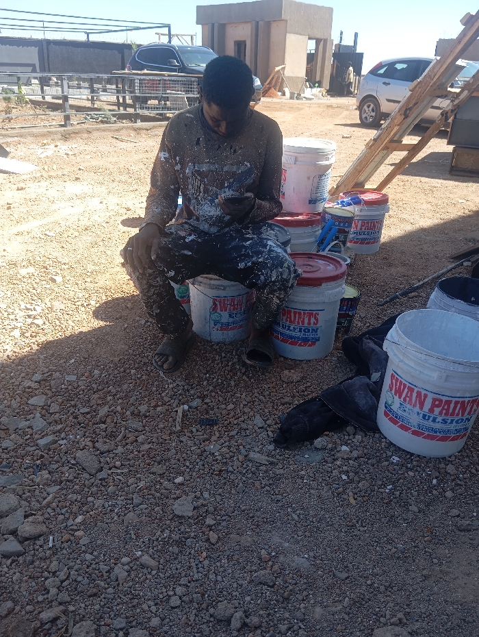 A solitary individual, a dark-skinned male, is seated outdoors on two stacked white "SWAN PAINTS EMULSION" buckets