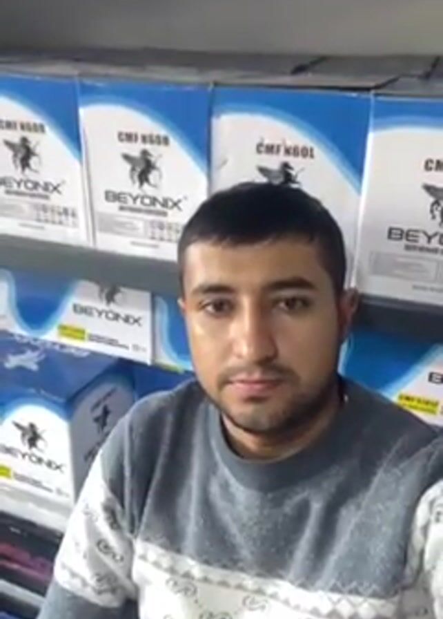 A man is recording a selfie-style video in what appears to be a storage area