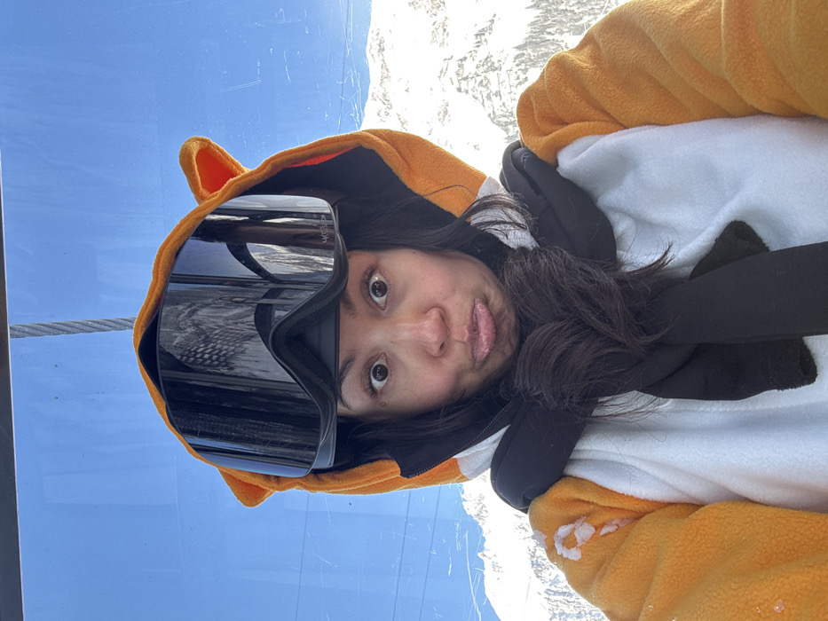 A female subject is depicted from the mid-torso up, inside a transparent ski lift cabin in Stuben, Austria. She has dark hair, wide eyes, and a puckered facial expression. She wears an orange and white hooded animal-themed jumpsuit with visible ears on the hood. Black ski goggles are positioned on top of the hood. A black scarf is tied around her neck. Small white particulate matter, consistent with snow, adheres to the orange sleeve of the jumpsuit. Through the transparent cabin window, a clear blue sky and snow-covered mountain terrain with sparse conifer trees are visible. A ski lift cable is discernible in the upper right portion of the image.