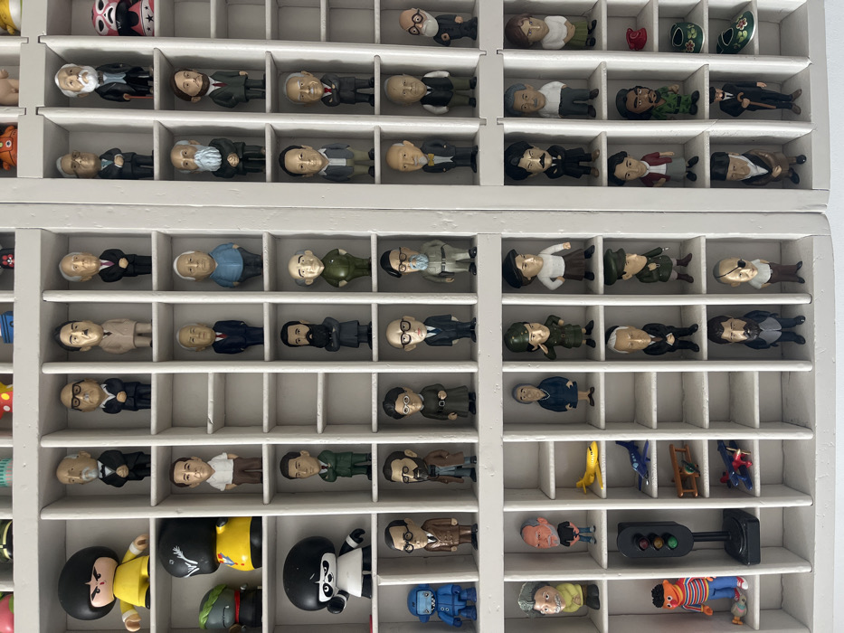 A full-frame, eye-level photograph presents a detailed view of an extensive collection of miniature figurines meticulously arranged within a white, multi-compartmented display shelf
