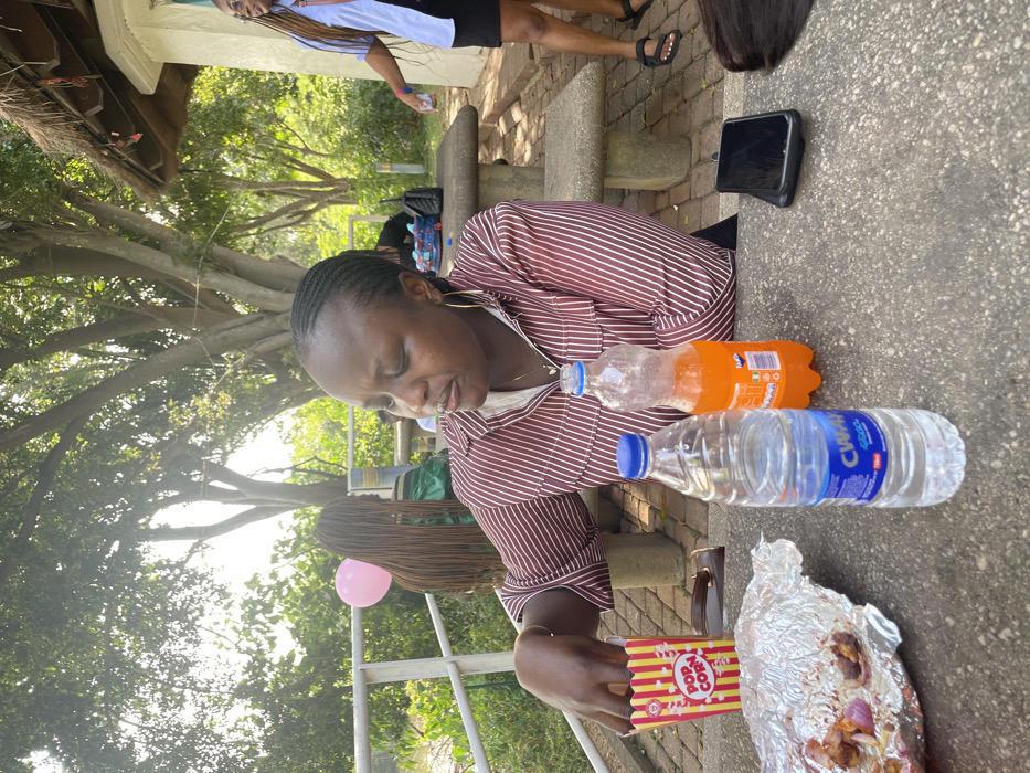 The image depicts an outdoor recreational area, specifically within Jabi Lake Park in Abuja, Nigeria, characterized by stone picnic tables and dense foliage under dappled sunlight. In the foreground, an adult female with dark skin and dark braided hair is seated at a grey concrete picnic table. She is wearing a maroon and white striped long-sleeved shirt and gold hoop earrings. Her gaze is directed towards the left side of the frame, with her eyes partially closed. Her right hand is reaching into a red and yellow "Pop Corn" box. On the table are additional items: a crumpled piece of aluminum foil containing remnants of food, including what appears to be grilled meat and sliced red onions; a sealed clear plastic bottle of CWAY branded water with a blue cap; an open clear plastic bottle of Fanta orange soda; and a black smartphone in a black case lying face down. A small, dark-colored object, possibly a wallet or sunglasses case, rests beside the popcorn box. In the middle-left background, another individual with long brown braids is partially visible from behind, seated at a similar stone table. A pink balloon floats near this individual. In the right background, a second female is partially visible, standing or leaning. She has light brown braids, wears a light blue collared shirt, dark shorts, and black sandals. She appears to be holding a small object in her left hand. The background features numerous large trees with green leaves. A light-colored metal railing is present in the far left, behind which a body of water is faintly visible. To the far right, a small, white, circular building with a thatched roof is visible, consistent with a park kiosk or shelter. The ground beneath the tables is paved with grey interlocking bricks.