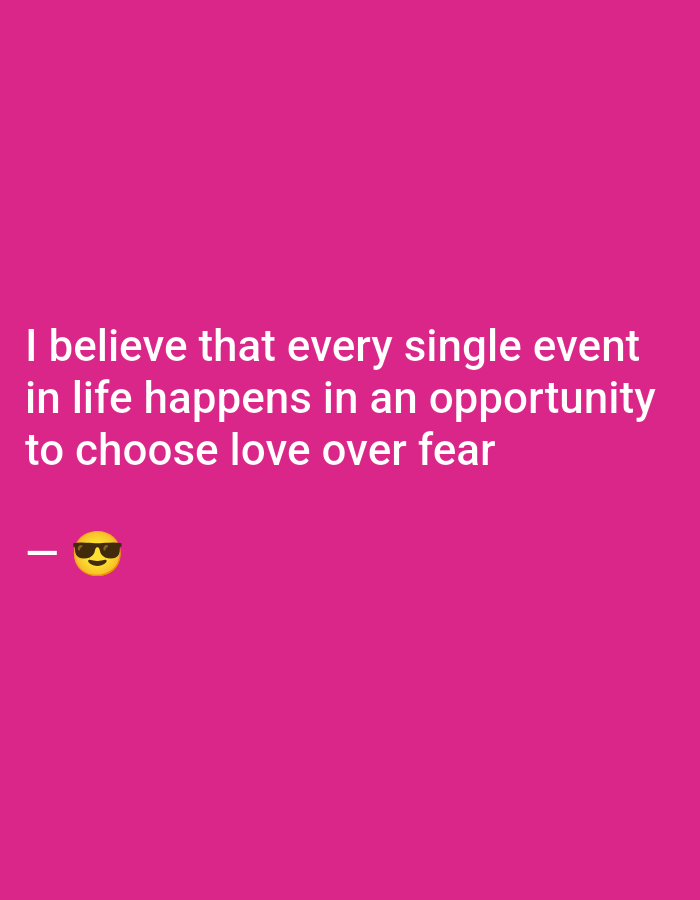 A motivational message is displayed on a vibrant pink background. White text states, "I believe that every single event in life happens in an opportunity to choose love over fear." Below the text, a horizontal line precedes a smiley face wearing sunglasses. The overall composition is simple, featuring a powerful sentiment conveyed through text and a lighthearted emoji.