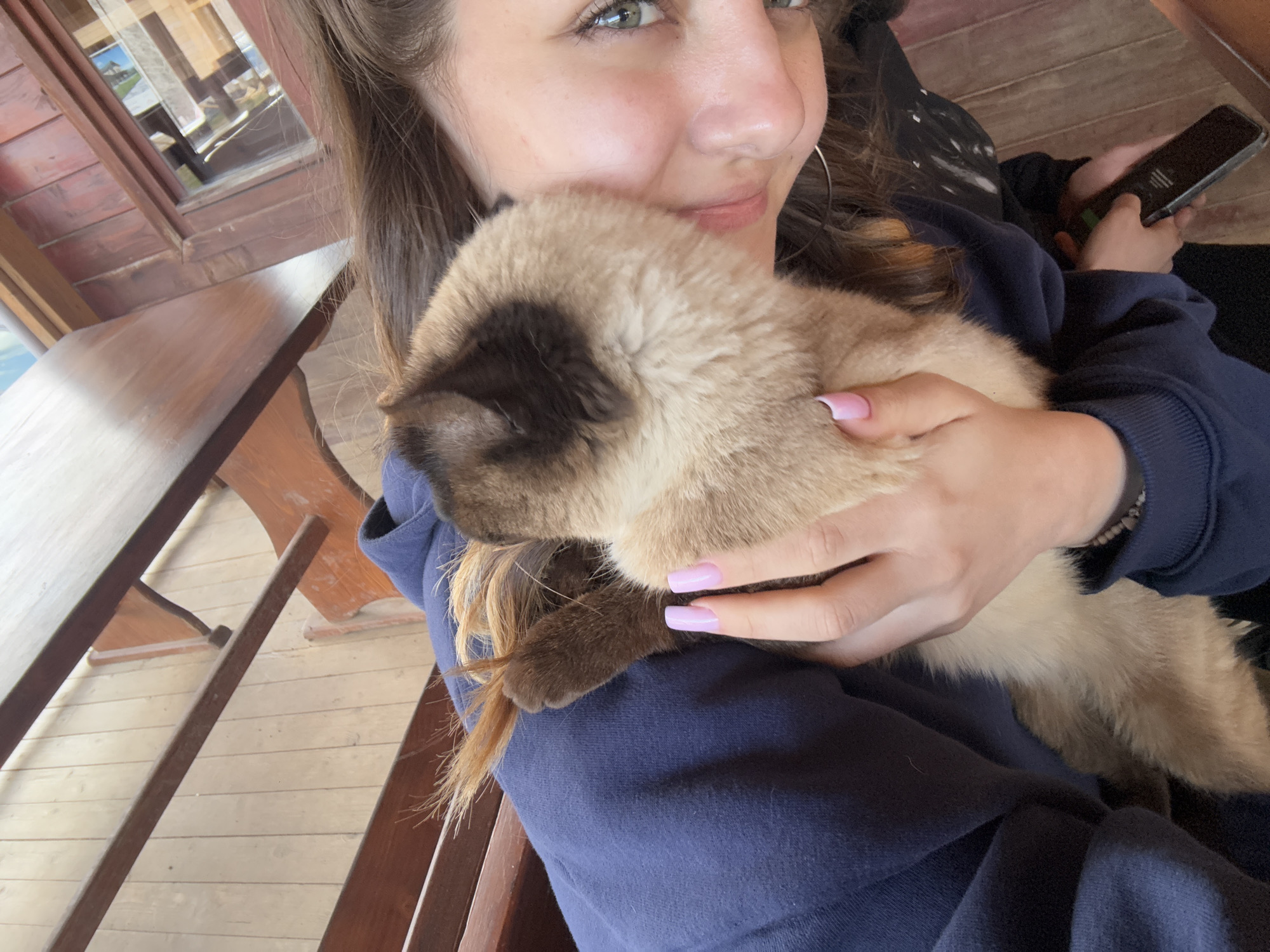 A young woman is holding a Siamese cat in her arms. She is looking at the camera and smiling slightly. She is wearing a navy blue sweatshirt and has long brown hair. She has manicured nails painted light pink. In her other hand, she is holding a cell phone. The location appears to be an outdoor porch or deck with wooden structures. Based on the location metadata, the scene is in Kovachevtsi, Bulgaria. The scene is daytime and well-lit. The photo is a close-up and the focus is on the woman and the cat.