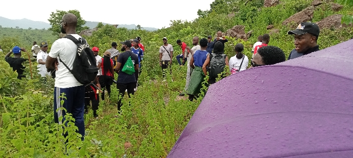 The image depicts approximately 20-25 individuals, predominantly young adults of African descent, situated on a narrow, unpaved path traversing a densely vegetated, hilly landscape in Girei, Nigeria. The foreground on the lower right is partially occupied by a wet, purple umbrella displaying visible water droplets. The individuals in the midground are dressed in casual outdoor attire, including t-shirts, pants, and several with backpacks and caps. They are spread out along the path amidst lush green foliage, primarily low-lying shrubs. Actions include standing, conversing, and one individual in the mid-right background holding a mobile phone upwards, suggesting photography or recording. The background features ascending terrain with visible rocky outcrops and a more heavily forested hillside. Distant hills are discernible under an overcast sky.