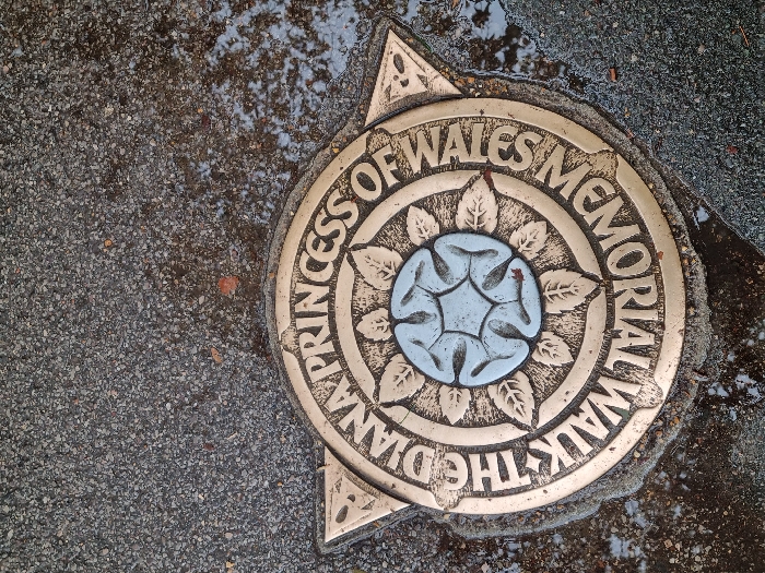 The image displays a weathered, circular bronze-colored metallic plaque, approximately 30-40 cm in diameter, embedded flush into a dark grey, coarse-grained asphalt or paved surface. Four triangular protrusions extend radially from the main circle, one at each cardinal direction, creating a star-like outline. The plaque's outer ring bears the embossed inscription "THE DIANA PRINCESS OF WALES MEMORIAL WALK" in capital letters. The inner design features a central five-petal rose rendered in a light blue-grey material, surrounded by a ring of embossed metallic leaves. The entire plaque shows signs of patination and some dirt accumulation, with small water puddles and moisture on its surface and the surrounding pavement, indicating damp conditions. Small pieces of organic debris, possibly leaves, are visible around the plaque. This marker identifies its location as part of the Diana, Princess of Wales Memorial Walk, which traverses Kensington Gardens, Hyde Park, St James's Park, and Green Park, all within the city of London, United Kingdom.