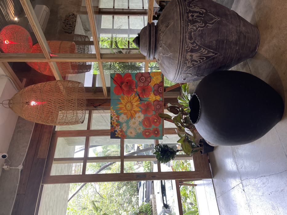 The image depicts the interior of a commercial or hospitality establishment, likely a cafe or restaurant, located in Bogor, Indonesia. The scene is dominated by a combination of natural light entering through large, framed glass panels on the left and artificial lighting from overhead fixtures. In the foreground, two large decorative ceramic or stone vessels stand on a light-colored, textured concrete floor. The closer vessel, on the left, is black, ovoid in shape, with a raw, undulating rim. To its right, a taller, dark gray vessel with a lid features intricate bas-relief carvings. Behind these vessels, a colorful floral painting on two panels, mounted on a wooden easel, serves as a central decorative element. The painting features an array of daisies, sunflowers, and other red and orange blossoms against a light teal background. Potted green plants are arranged around the base of the easel. Overhead, a prominent, elongated pendant light fixture crafted from woven natural fibers hangs from the ceiling, illuminating a red bulb within. Reflections on the glass panels reveal at least two similar red-lit, woven pendant lights. The ceiling is composed of raw concrete and wooden beams. A white security camera (CCTV) is mounted near the ceiling in the upper left corner. An air conditioning unit is visible in reflection on the right. Through the large wooden-framed glass panels on the left, an outdoor environment is visible, characterized by lush green foliage and trees. Partially visible parked cars, including a silver sedan, suggest a parking area or street immediately outside. No people are present or engaged in any discernible action or interaction within the frame.