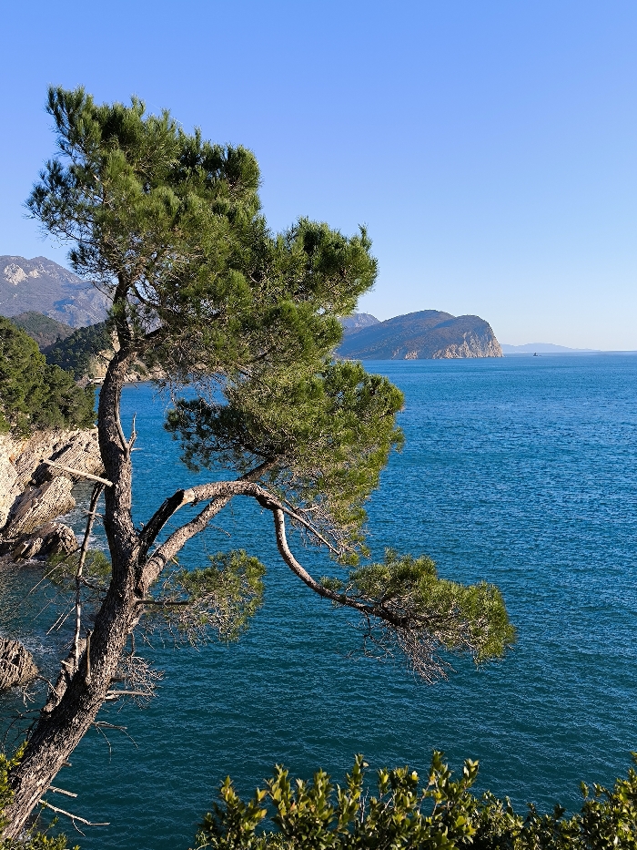 The image displays a coastal landscape in Mirište, Montenegro, under a clear, bright blue sky. A large pine tree with a dark brown, gnarled trunk and dense green needle foliage dominates the left and central-upper portions of the frame, its lower branches extending horizontally over the water. Below the pine tree, layered rocky cliffs and smaller green vegetation lead down to the sea. The expansive body of water is a consistent teal-blue, showing surface ripples across its entire visible area. In the background, distant green mountains and a prominent, treed landmass with a light-colored cliff face are visible projecting into the sea. A small, dark, indistinct object, potentially a boat, is present on the water near the distant landmass. A strip of green foliage from a bush is visible along the bottom edge of the frame. No individuals are depicted.
