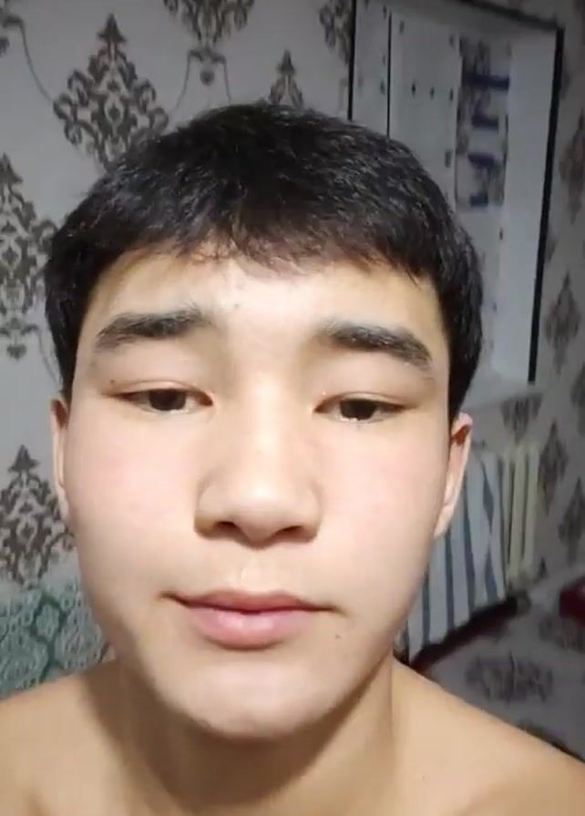 A young man with dark hair stands shirtless in a room with patterned wallpaper. He looks directly at the camera with a neutral expression. He then smiles slightly and winks one eye before reverting to a neutral expression. The room contains a wardrobe or cupboard with partially obscured contents.
