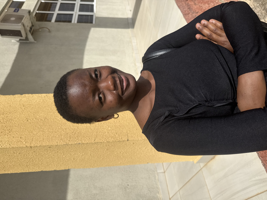 A mid-shot portrait photograph captures a young adult female smiling, with a light-colored building and a yellow-orange pillar as the background. The scene is set outdoors in Jos, Nigeria. The subject, a woman with dark skin and short, dark hair, looks directly at the camera. She wears a black long-sleeved top with a round neck and ruched detailing on the chest, along with a small gold-colored hoop earring in her left ear. Her arms are crossed over her chest, and a black strap, possibly from a shoulder bag, is visible over her right shoulder. Her smile reveals teeth, potentially with dental braces on the upper row. The background features a textured yellow-orange concrete pillar on the left. To the right, a light grey-beige building wall is visible, mounting an outdoor air conditioning unit above a white-framed, gridded window. The ground beneath the subject and pillar consists of light-colored tiles, with a reddish-brown edge visible at the base of the pillar. The scene is illuminated by strong natural sunlight, casting shadows on the wall and the subject.