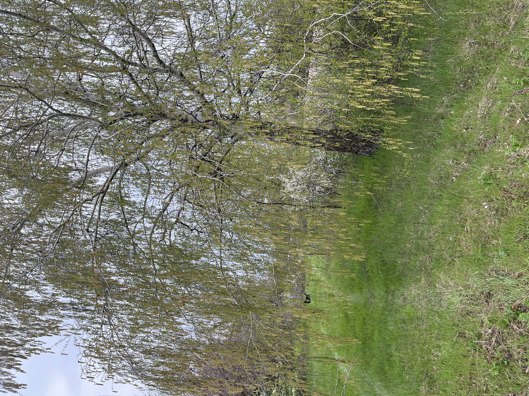 The image depicts a grassy field with trees in Levski, Bulgaria. The trees have white bark and branches with small green leaves and yellow catkins. The grass is green and lush, with some patches of brown and dry grass. In the distance, there are other trees with white flowers. A path cuts through the grass.