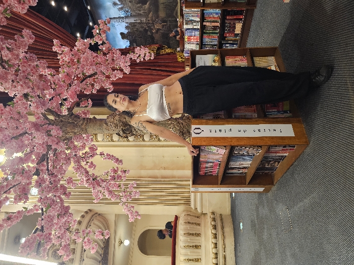 A woman in a white top and black pants lies on a bookshelf, with a cherry blossom tree near her head. The bookshelf is labeled "Letras de Plata". She is angled horizontally across the image. In the background, there is a red curtain and other bookshelves. The room has architectural details with decorative trim and lighting. The floor appears to be carpeted with a gray pattern.