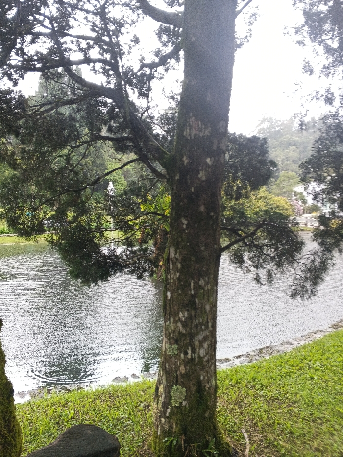 The image presents an outdoor, natural scene situated in the city of Matopos, Zimbabwe. A prominent, vertically oriented tree trunk, heavily covered with moss and lichen, dominates the right foreground, extending upwards and out of frame. Its dark, dense branches spread across the upper portion of the frame, partially obscuring the hazy, overcast sky. Lush green grass with visible roots covers the ground in the lower foreground, extending to the edge of a body of water, likely a lake or pond. The water's surface is extensively rippled, suggesting active precipitation or wind, and reflects the dull sky. In the mid-distance, a white fountain actively sprays water vertically from the center of the water body. The far bank of the water exhibits a structured edge, possibly stone, and is bordered by additional green foliage. The background features dense tree lines and forested hills receding into a bright, misty horizon. No individuals are present. A dark, moss-covered object, possibly a stone or part of another tree, is partially visible in the extreme lower-left foreground.