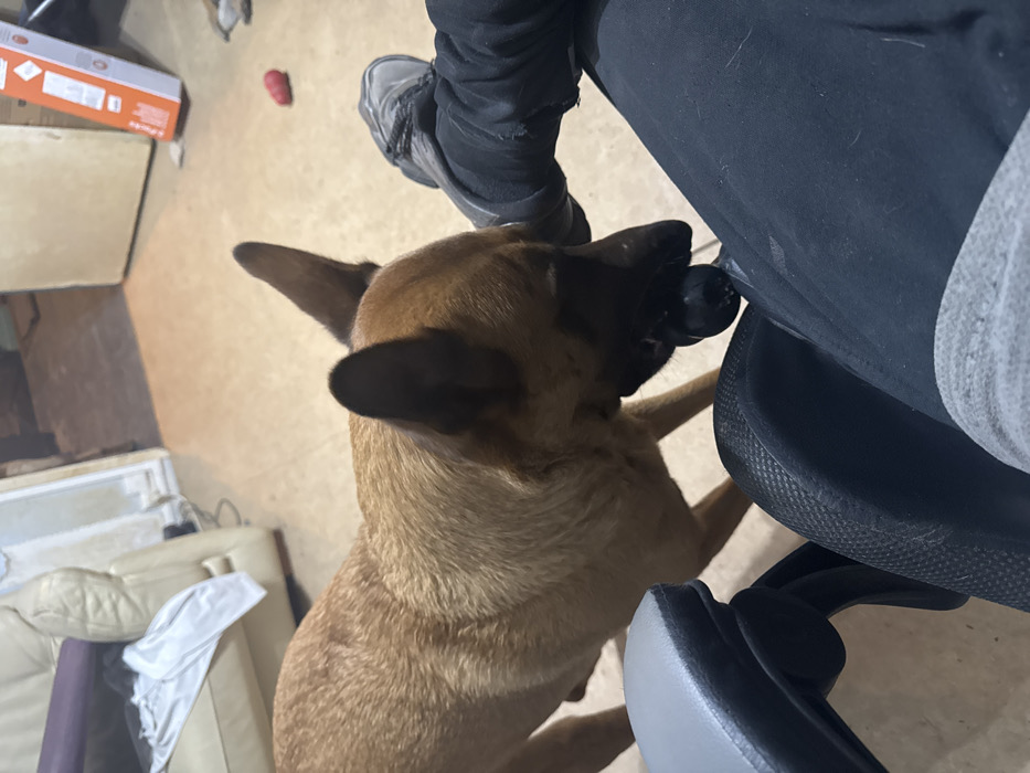 The scene depicts an interior setting, identified as a private residence or common area in Magny-les-Hameaux, France. The primary subject is a medium-sized tan-colored dog, possibly a German Shepherd or similar breed, positioned on a light brown floor. The dog's head is lowered, and it holds a dark, spherical object, likely a toy, in its mouth, engaging with a seated individual. The visible portion of the human subject includes lower legs dressed in dark gray or black pants and gray athletic shoes. The individual is seated in a black office-style chair, the armrest of which is visible in the lower left foreground. The environment in the background reveals a casual, somewhat cluttered domestic space. A light-colored, possibly beige, upholstered sofa or armchair is situated in the mid-left, with a white garment draped over it and a purple cylindrical object resting on its arm. Further back on the right, an orange and white cardboard box, appearing to be product packaging, stands upright against a wall. A small, red, elongated object, consistent with a dog toy, lies on the floor in the mid-right background. The floor throughout the visible area is a consistent light brown tone. Lighting appears to be artificial, illuminating the indoor setting.