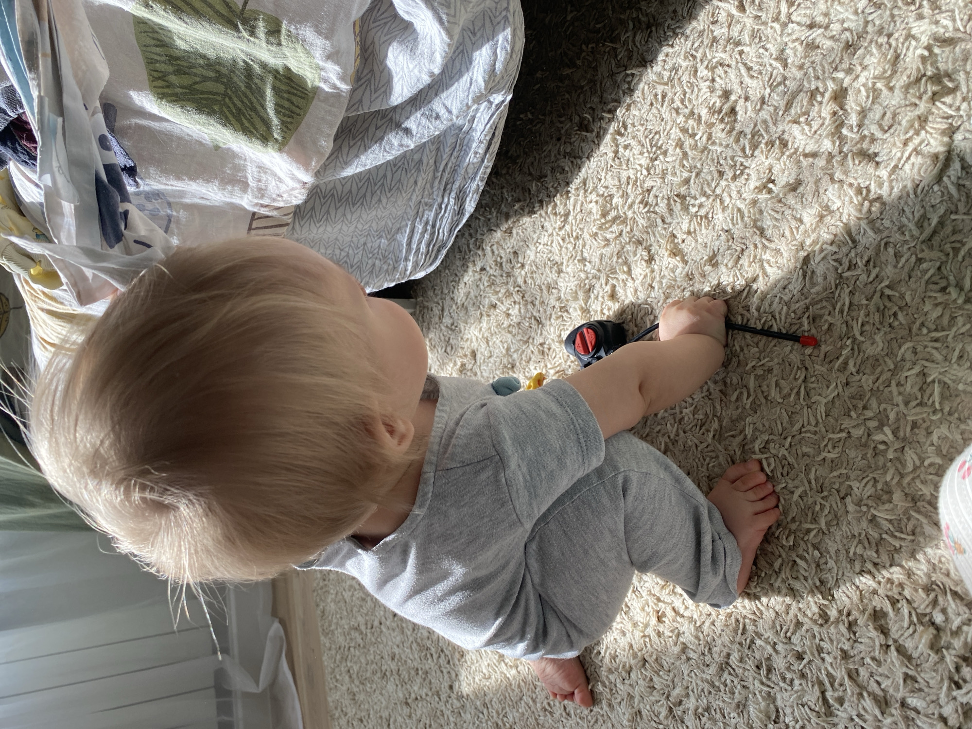 A toddler with light blond hair is squatting on a light-colored shag rug. The toddler is wearing a gray, long-sleeved outfit. The child is holding a black object with a red end in their right hand. To the left of the child is a pile of bedding. The scene is brightly lit, casting shadows on the rug. The location is presumably a domestic interior. There is no information to suggest the location is in the city of Chaikovsky, Russia.