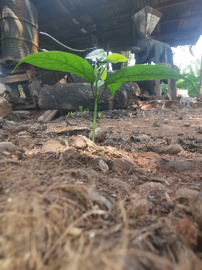 This image depicts a low-angle view of a small green plant, approximately 20-25 cm tall, with two prominent leaves, rooted in a dry, reddish-brown soil foreground. The soil is densely covered with dried organic matter, resembling palm kernel husks and other plant debris. In the midground, the ground transitions to exposed soil with scattered rocks, darker charred debris, and sparse green sprouts. The background reveals industrial equipment under a rudimentary shelter with a corrugated roof. To the left, a rusted, dark metal barrel rests on wooden planks amidst rubble. To the right, a dark, heavy-duty machine with a hopper on top and a cylindrical crushing or grinding component is visible. The scene suggests an outdoor processing area, possibly for agricultural products, within the city of Otolokpo, Nigeria. No individuals are present, and no active processes or interactions are depicted.
