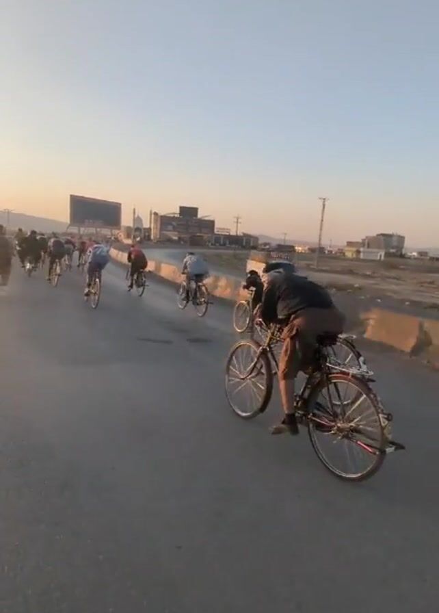 group of people riding bicycles on an asphalt road, moving from left to right. The road appears to be in a somewhat desolate, possibly urban or suburban area. A few motorcycles follow along with the cyclists. The bikes seem to be older models with traditional frames and tires. Buildings and an open area with sparse vegetation are visible in the background. A mosque or religious structure can be seen in the distance, adding context to the location. The sky is light blue and clear, suggesting the time of day is either early morning or late afternoon.