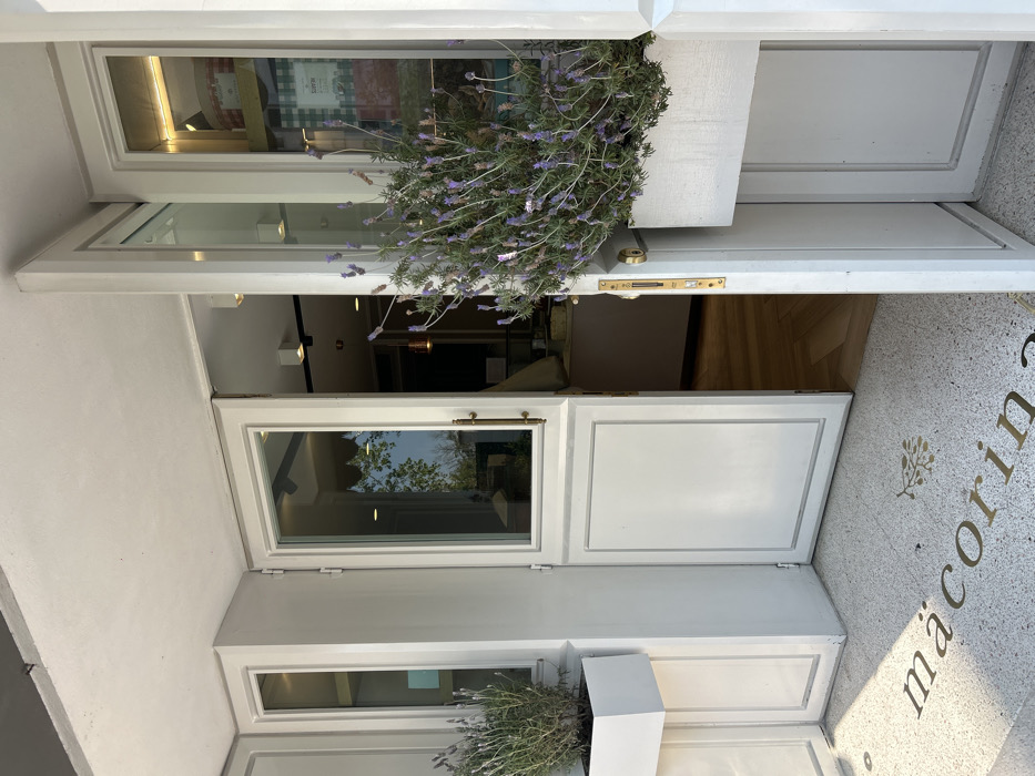 A ground-level view presents a white-framed doorway ajar. Plants decorate both sides of the entrance, one overflowing above the door. The interior shows a glimpse of a wooden floor and a lit room. On the ground outside, lettering is visible, spelling out "macorina," with decorative floral motifs. The door includes a window panel, reflecting a sky view.