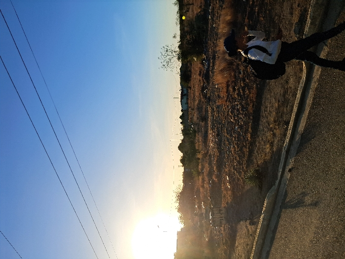 A figure stands on asphalt beside dry grassland beneath a bright, low sun. The figure, wearing a cap, white shirt, and dark pants, is angled toward the field with a dark backpack. Powerlines stretch across a clear blue sky in the background. The landscape is mostly arid, and the view is distorted by the angle of the image.
