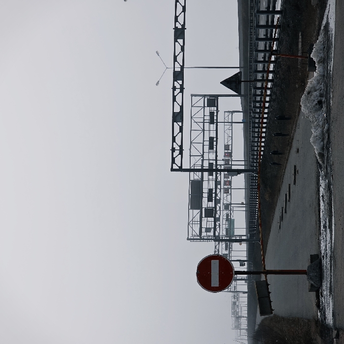The image captures an outdoor scene at what appears to be an entry point to a major highway in Kronstadt, Russia, under an overcast, light grey sky. In the immediate foreground left, a red and white circular "No Entry" sign is affixed to a rust-colored pole anchored by a concrete base. A horizontal orange-brown barrier arm extends from this pole, obstructing a narrow, dark asphalt road. A dark, rectangular object is attached beneath the "No Entry" sign on the pole. Several dark, rectangular road markers or remnants are present on the asphalt road surface. To the immediate right in the foreground, a mound of dirty, melting snow and slush rests on the asphalt. Beyond the barrier, a multi-lane highway, possibly elevated, stretches from the midground towards the background on the right. This highway is bordered by a dark metal guardrail system featuring visible orange reflective elements on its posts. Multiple large, dark metal gantry structures, designed for road signs or electronic displays, span across the highway. Some of these gantries display indistinct signage and illuminated red lights. A tall street lamp with a twin-arm fixture is positioned on the right side of the highway, extending upwards. The background consists of a uniform light grey sky, with additional gantry structures receding into the atmospheric haze. No individuals or vehicles are present in the scene.
