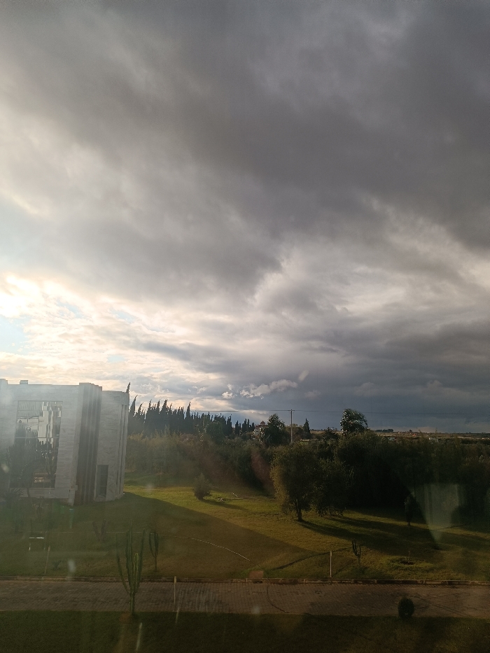 A landscape view reveals a building on the left and a blend of trees and foliage stretching into the distance under a cloudy sky. The building, possibly made of stone, has a modern design with large windows. A grassy field dotted with scattered trees fills the space between the building and the distant tree line. The sky is dominated by dark, ominous clouds, with a hint of sunlight breaking through on the left side of the frame.