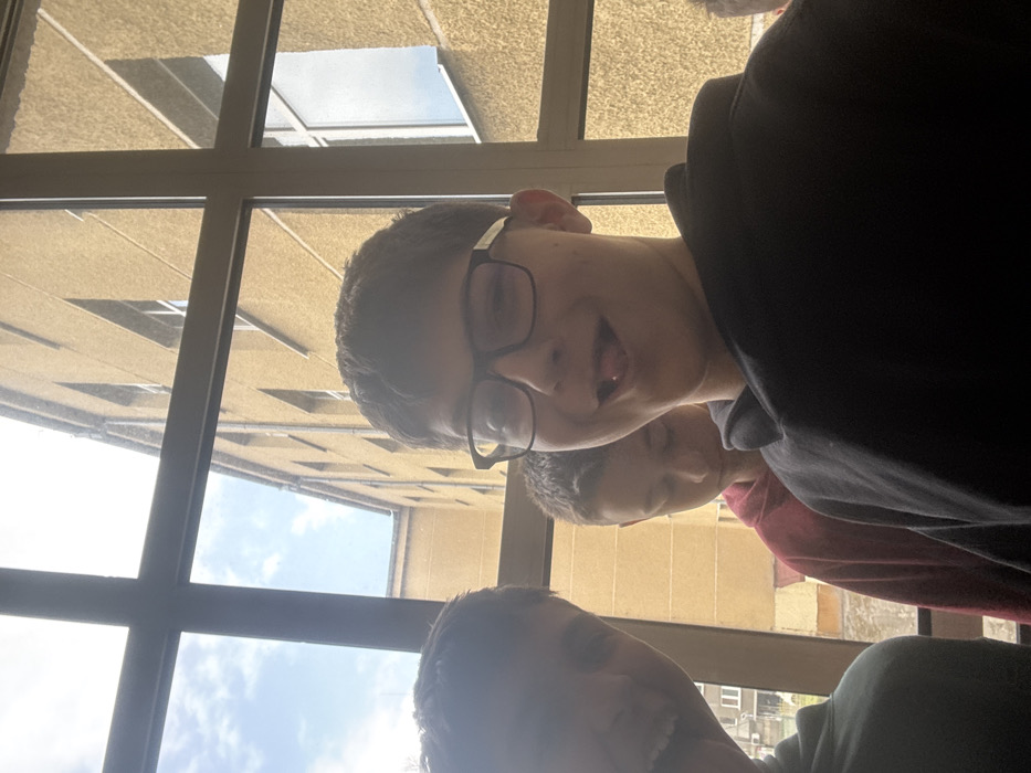 A close-up photograph captures three young males positioned indoors, facing the camera, with a multi-pane window in the background looking out onto an exterior building