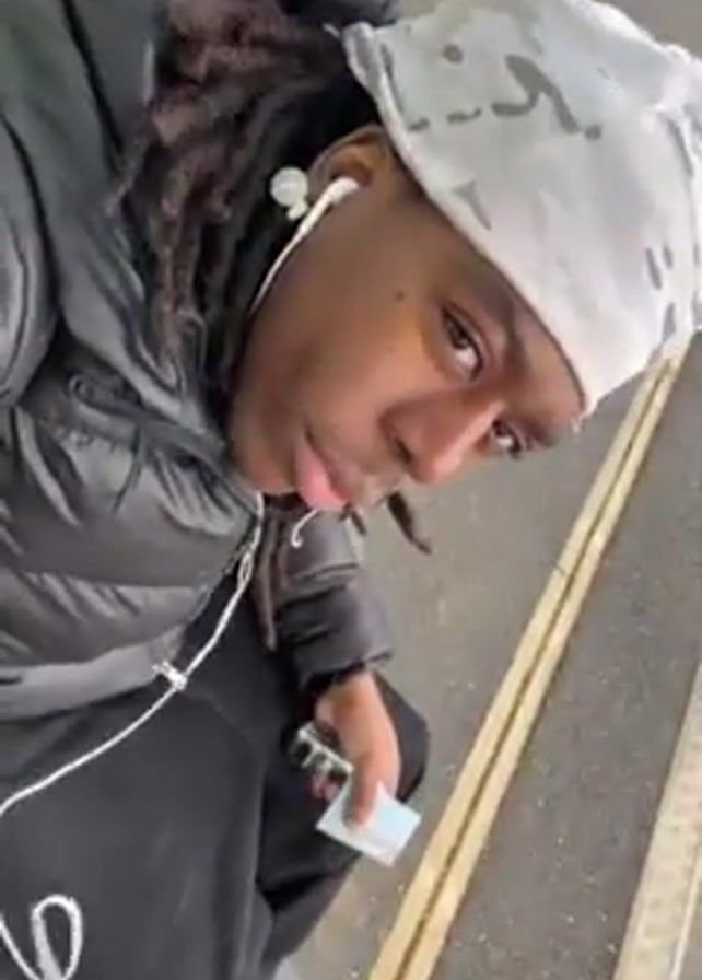 A young man with dreadlocks is seated outdoors. He is wearing a white patterned headscarf, black puffer jacket, and black pants. He has white earbuds in his ears. He is holding a small green and white object in his hand. The man is sitting under a shelter, with a gray wall and windows behind him. The ground is gray with a yellow line. The camera is tilted upward and moves slightly. The man looks at the camera with a neutral expression.