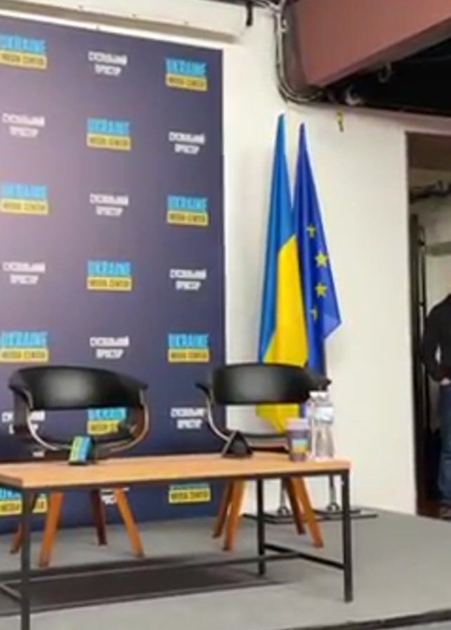 The scene shows an indoor setting in what appears to be a media center or conference room. Two black chairs sit on a small stage behind a narrow wooden table. On the table are a water bottle and a coffee cup. Behind the chairs are two flags: the flag of Ukraine and the flag of the European Union. A backdrop bearing the words "UKRAINE MEDIA CENTER" and "СУСПІЛЬНИЙ ПРОСТІР" (which translates to "Public Space" in Ukrainian) is repeated multiple times. To the right of the flags, a man is visible, standing in what looks like a doorway. The overall environment suggests an official or semi-official setting for a presentation or press conference.